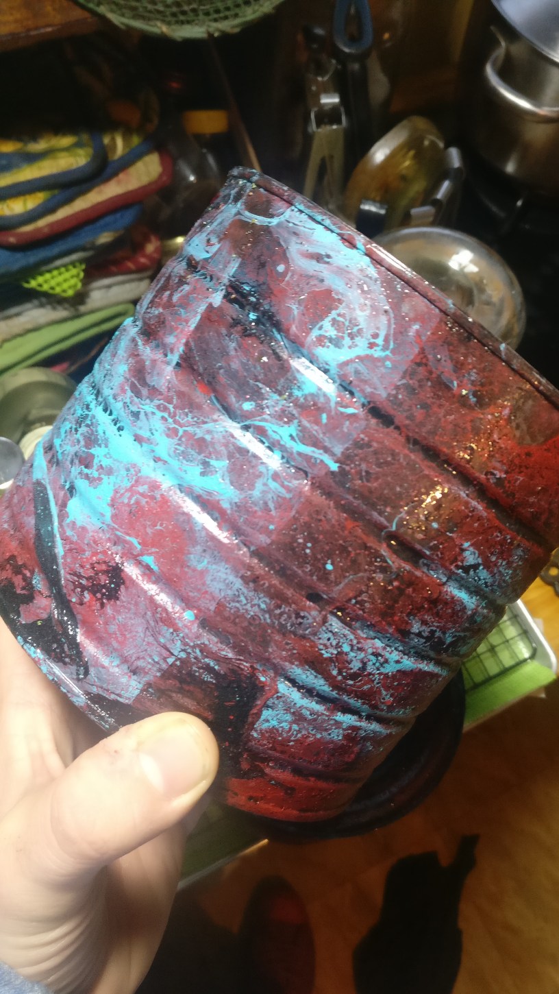 Just a little trick I stole from my mom. Spray painted an empty coffee can, spray painted it place, than took a pan of water. Sprayed blue, red, and black paint and dipped the can in.